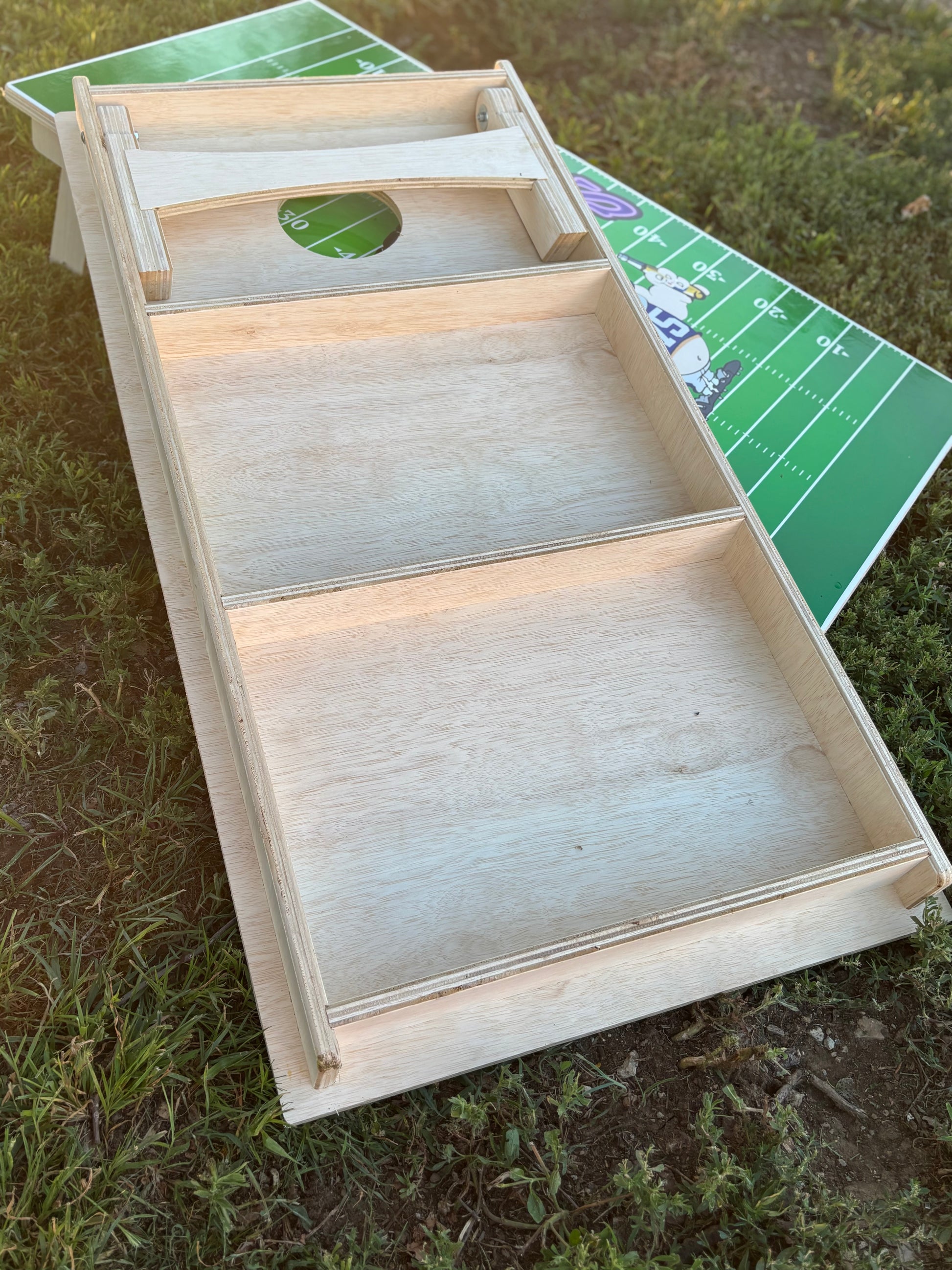 This 100% Made in Manhattan, KS. Set of (two) Custom corn hole boards. These heavy duty boards are made of 3/4 inch wood. Constructed to have no bounce in game play and to last a life time. All joints are recessed dado joints. legs are completely foldable for easy storage and transport.