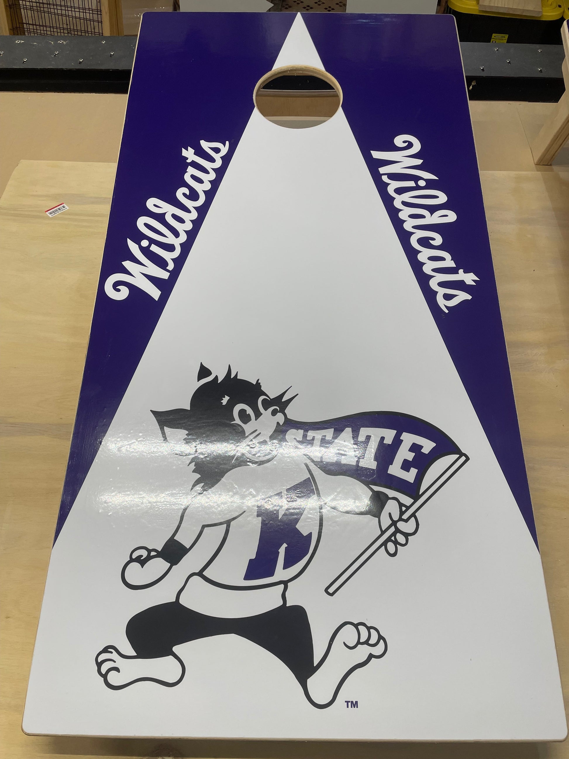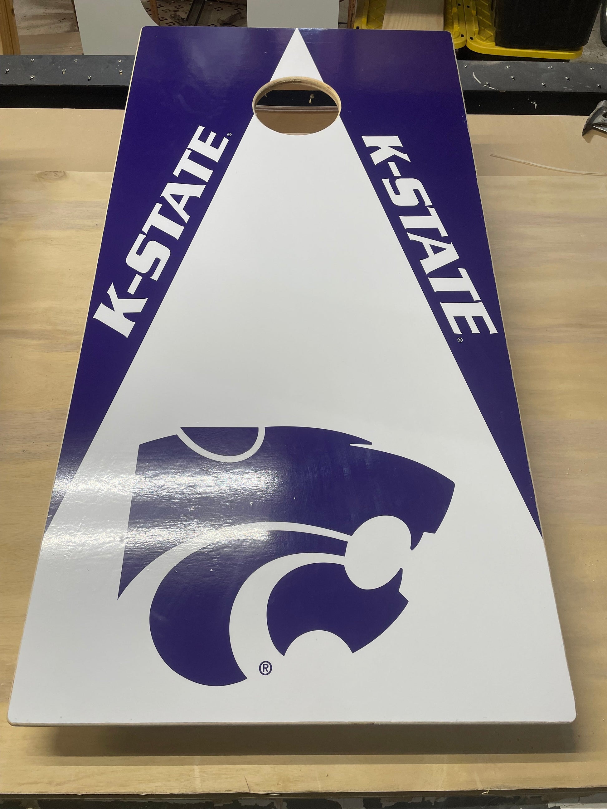 This 100% Made in Manhattan, KS. Set of (two) K-State corn hole boards. These heavy duty boards are made of 1/2 inch Plywood. Constructed just like our pro series just less cross bracing to make it more light weight and economical. All joints are recessed dado joints. legs are completely foldable for easy storage and transport.
