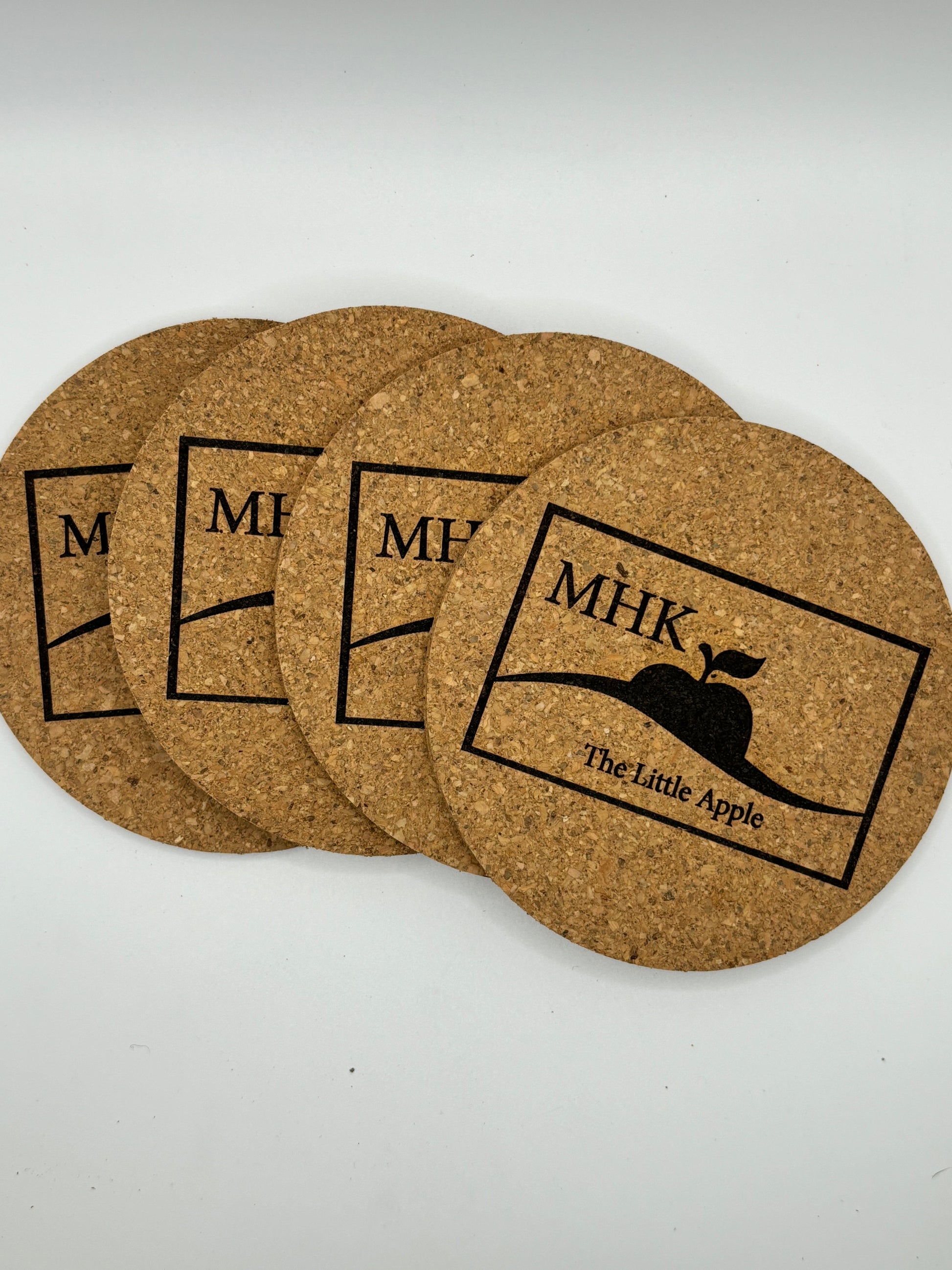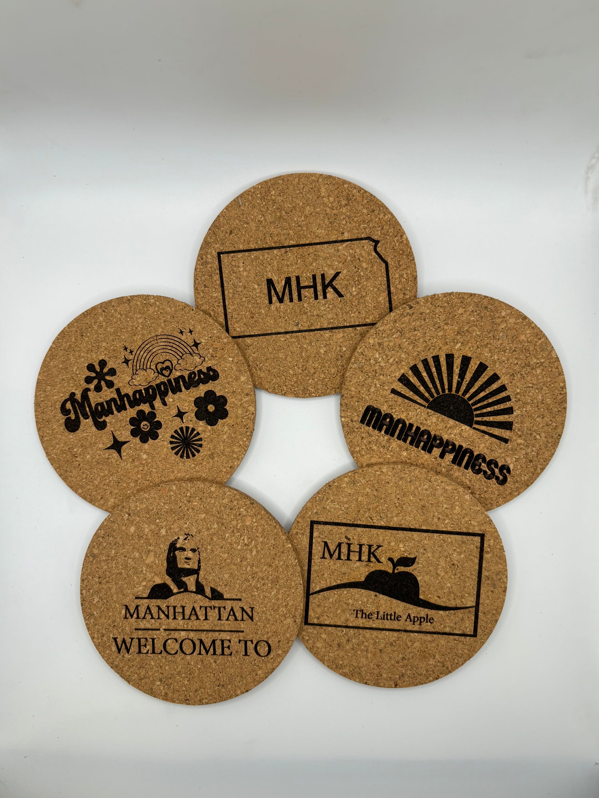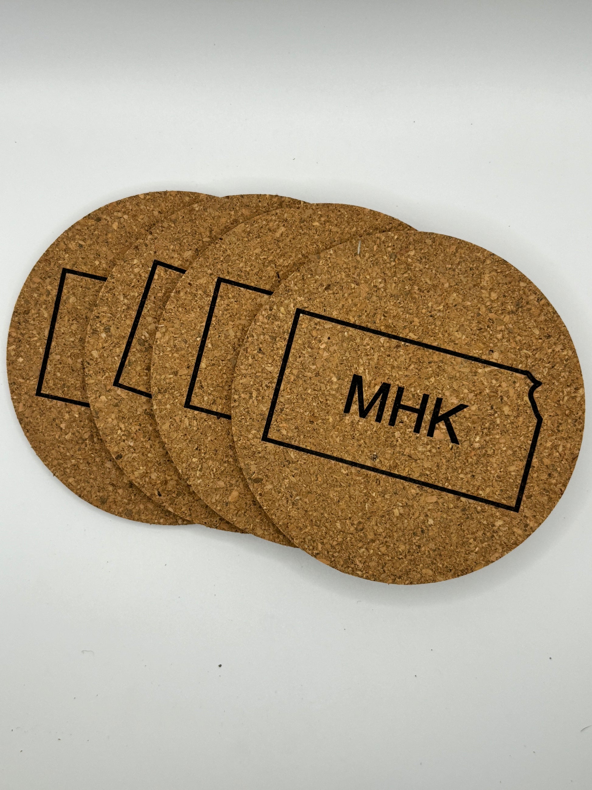 Celebrate your MHK spirit with this beautiful Cork Coasters! Measuring approximately 4 inches, laser-engraved Kansas themed logos of your choice.