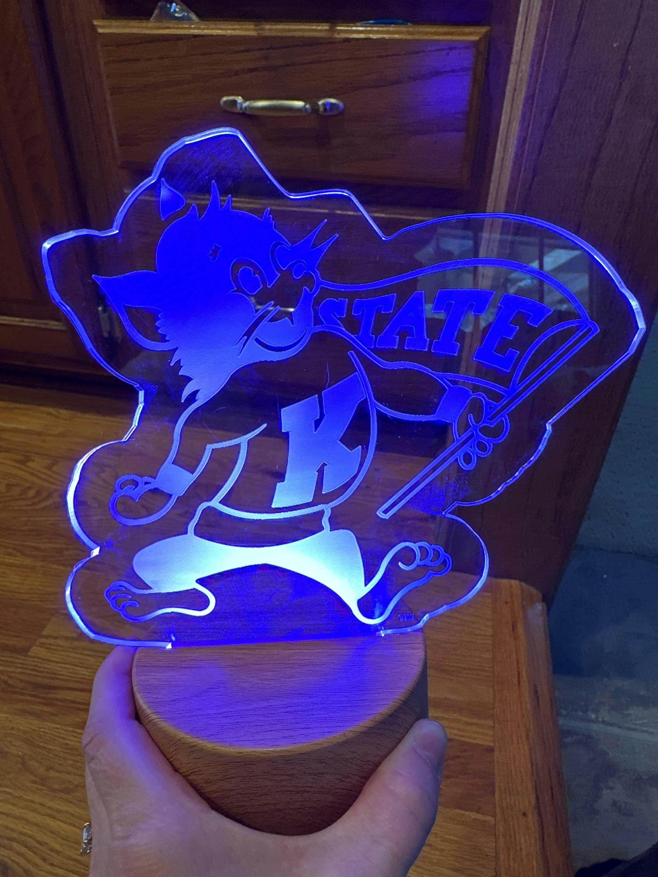 The Design of your choice is then etched into a sheet of acrylic and once set into the LED Color change base will give the perfect glow to show off your K-State spirit.