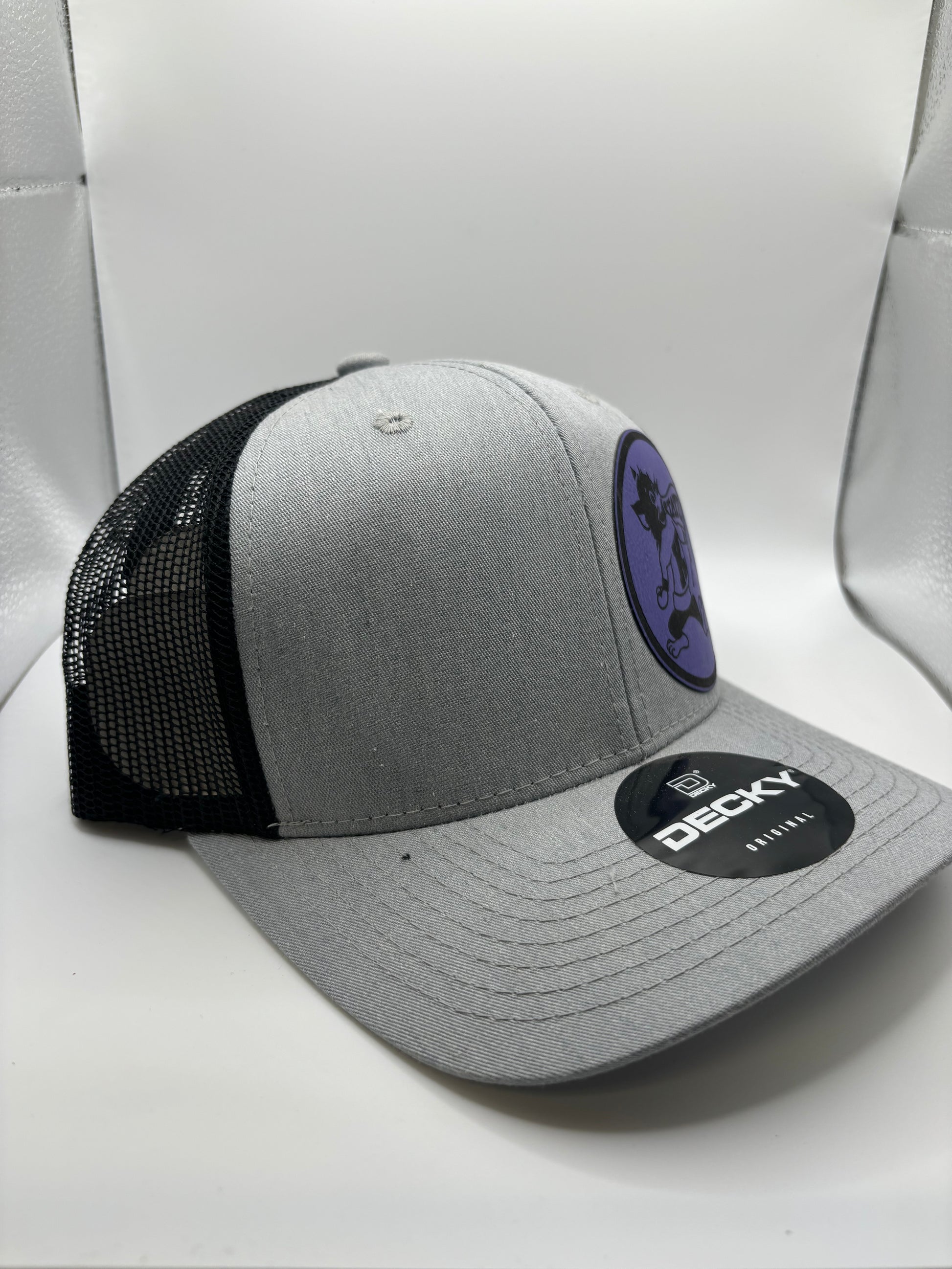 Grey/Black 6 Panel Hat with Black/Purple Willie Round Logo.